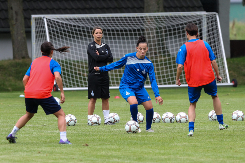 Der gesamte Freitagabend stand für die MSV-Frauen im Zeichen des Teambuildings: In zwei Kleinbussen wurden die Spielerinnen von Goch nach Xanten gefahren, ohne dass sie wussten, was auf sie zukommen würde. Trainerin Inka Grings hatte ihnen nur gesagt, sie sollten Bikinis einpacken. Die Begeisterung der Mädchen spiegelte sich in den Kommentaren wider, die am Mittag im Hotel aufzuschnappen waren: „Wir müssen bestimmt in einen Tümpel steigen“ oder „Ich mache nicht alles mit, bin ich hier im Dschungelcamp?!“ Als die Autos Kurs nahm auf die beiden idyllischen Xantener Gewässer Nord- und Südsee, sah es nach Strandbad, Segeln oder Wasserski aus. Doch die freudige Stimmung hielt bei den meisten Spielerinnen nur nur kurz. Denn das eigentliche Ziel war der Hochseilgarten, und die Seile und Stahlkabel in luftiger Höhe, die schon vom Bus aus zu sehen waren, ließen die eine oder andere erblassen.