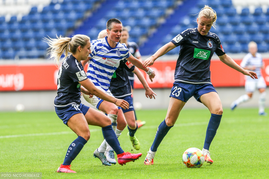 Zusammen mit Geldona Morina war es auch die eingewechselte Angerer, die sich vorne einreihte und die ersten MSV-Konterchancen auf dem Fuß hatte. Für Potsdam versuchte sich Zadrazil, aber MSV-Keeperin Meike Kämper war zur Stelle. Ein Schuss von Höbinger für die Gäste war das letzte offensive Lebenszeichen im ersten Abschnitt (34.). Für den MSV fehlten Radtke nach einer Zielinski-Flanke nur ein paar Zentimeter (38.) und die erste Hälfte endete pünktlich torlos.