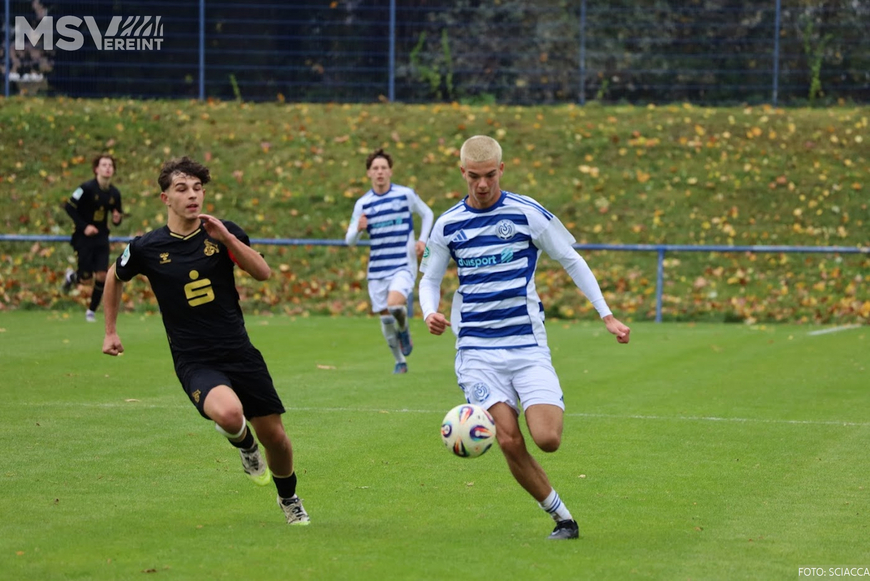 Beim Heimspiel gegen den 1. FC Köln lag unsere U17 am Sonntag bis zur 89. Minute mit 2:1 vorn, ehe der Tabellenführer spät doppelt zuschlug. „Wir haben vor allem in der ersten Halbzeit sehr gut gespielt“, berichtete Trainer Marc Auf dem Kamp. Ein Doppelschlag von Zarije Duric (30./45.) drehte das Spiel in Richtung MSV, doch Köln erhöhte nach der Pause den Druck. „In der Nachspielzeit haben wir nicht mehr standgehalten. Das tut mir für die Jungs unglaublich leid“, so der Coach.