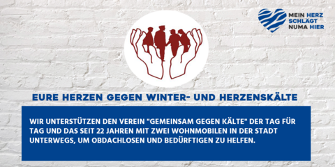 Eure Herzen gegen Winter- und Herzenskälte. Wir unterstützen den Verein "Gemeinsam gegen Kälte" der Tag für Tag und das seit 22 Jahren mit zwei Wohnmobilen in der Stadt unterwegs, um obdachlosen und Bedürftigen zu helfen.